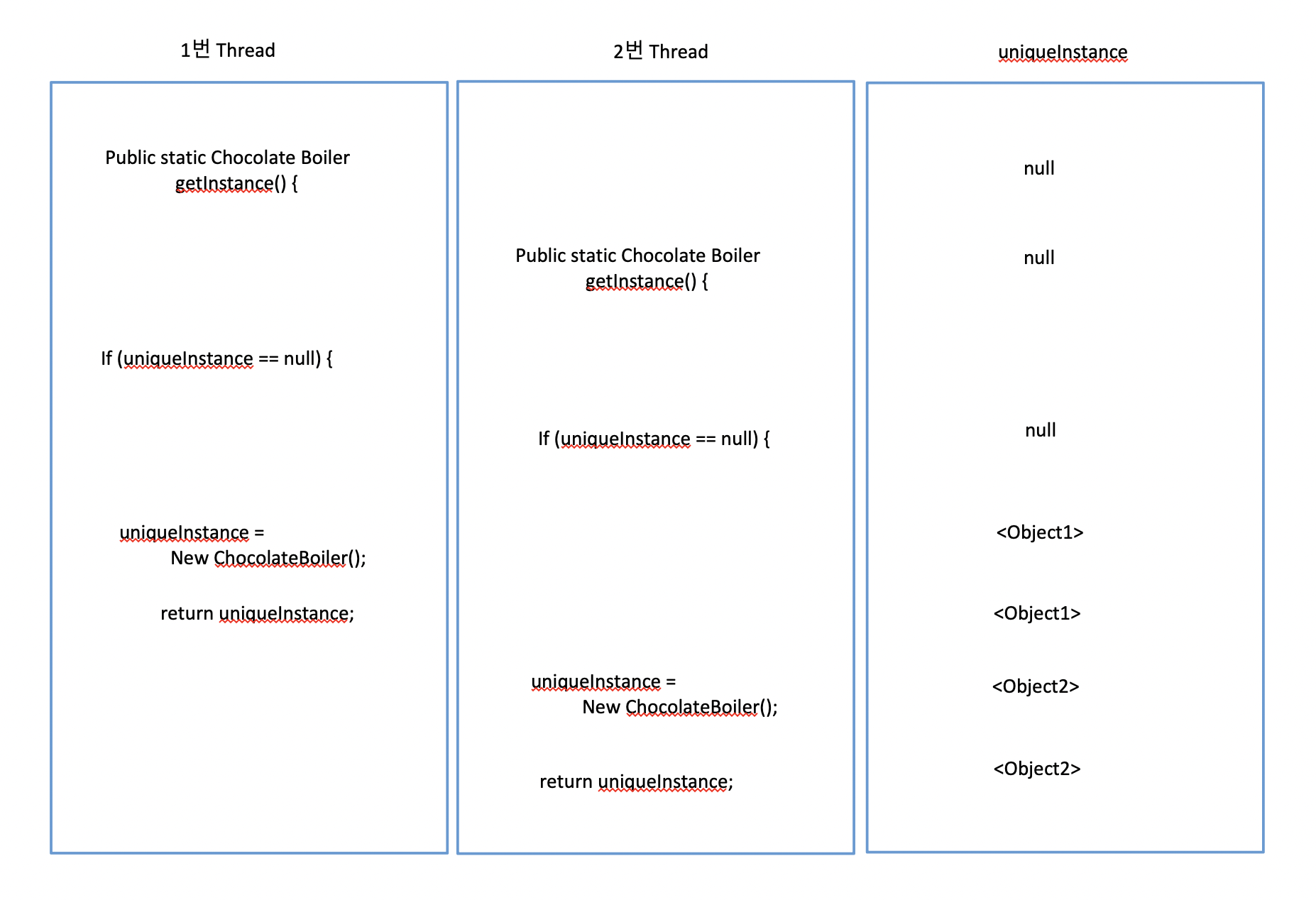 그런데 하나의 초콜릿 보일러를 대상으로 두 개의 ChocolateBoiler 인스턴스를 만들고 각자 따로 제어하면 큰일이 날 수도 있겠네요..